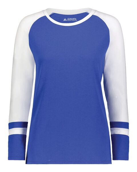 3.8 oz./yd_, 50/38/12 polyester/cotton/rayon triblend knit White/ Grey Heather is 4.7 oz./yd_ Scoop neck Raglan sleeves Tagless label
