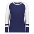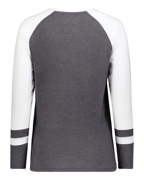 3.8 oz./yd_, 50/38/12 polyester/cotton/rayon triblend knit White/ Grey Heather is 4.7 oz./yd_ Scoop neck Raglan sleeves Tagless label