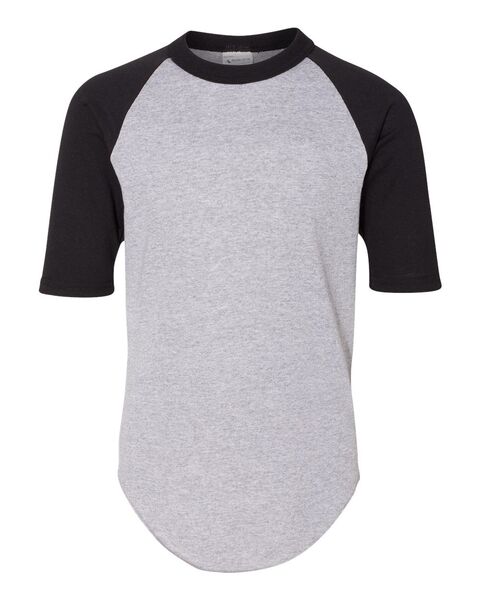 4.8 oz./yd_, 50/50 cotton/polyester jersey knit Contrast-color 1x1 rib collar and raglan sleeves Double-needle hemmed sleeves Serged fishtail bottom...