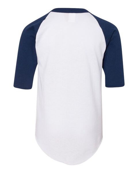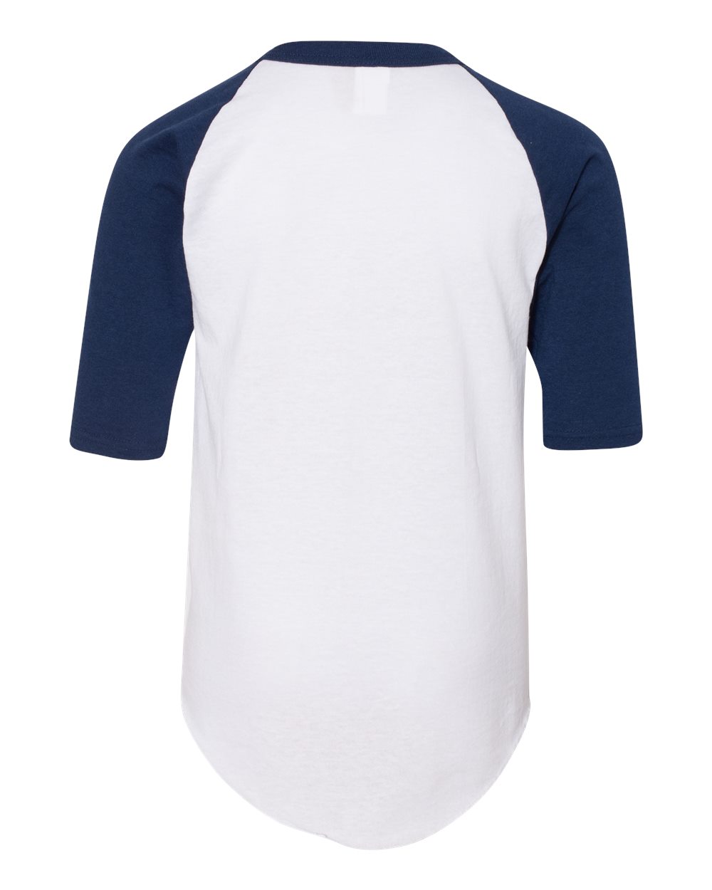 4.8 oz./yd_, 50/50 cotton/polyester jersey knit Contrast-color 1x1 rib collar and raglan sleeves Double-needle hemmed sleeves Serged fishtail bottom...