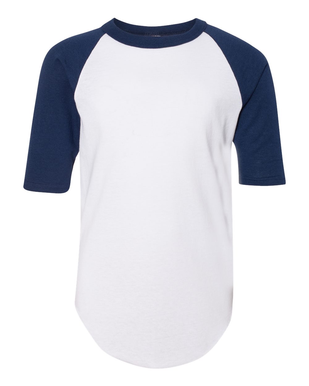 4.8 oz./yd_, 50/50 cotton/polyester jersey knit Contrast-color 1x1 rib collar and raglan sleeves Double-needle hemmed sleeves Serged fishtail bottom...
