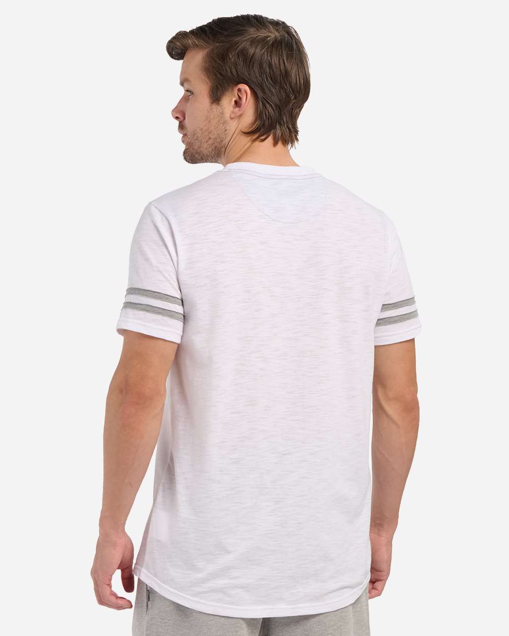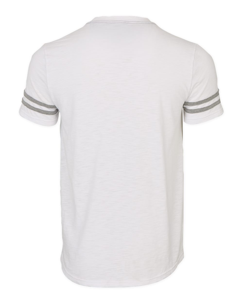 4.13 oz./yd_., 60/40 cotton/polyester, slub jersey 1x1 rib dye-to-match collar Oxford heather self-fabric half-moon and back neck tape Center front...