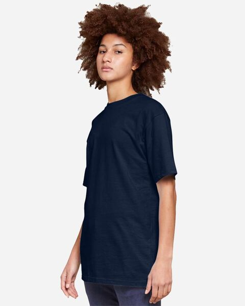 5.6 oz./yd_, 100% combed ringspun cotton; 20 singles Under 5% shrinkage Double-needle topstitch at sleeve, bottom hem, shoulders and armhole...