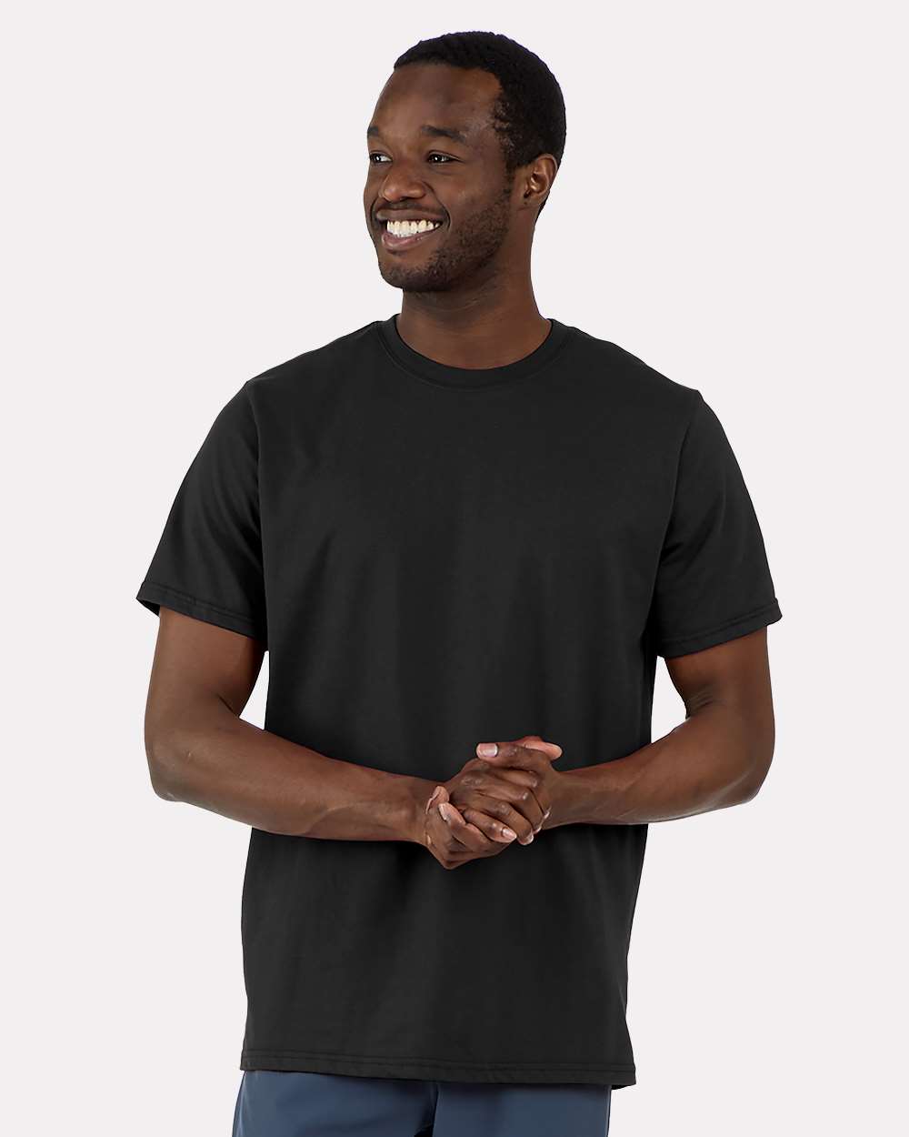 4.28 oz./yd_, 50/50 cotton/polyester Regular fit Double brushed jersey Folded neck band Self-back neck tape Heat-seal label