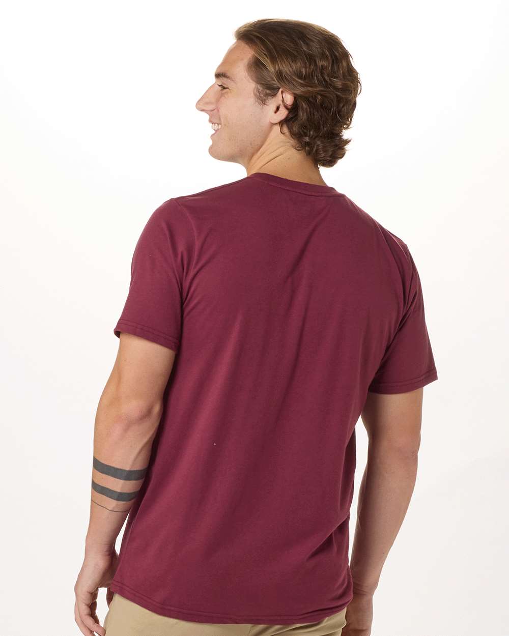 4.28 oz./yd_, 50/50 cotton/polyester Regular fit Double brushed jersey Folded neck band Self-back neck tape Heat-seal label