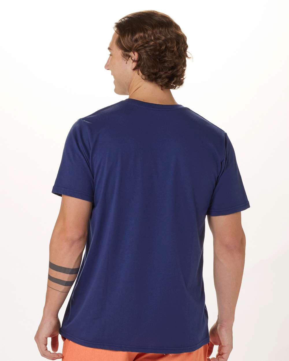 4.28 oz./yd_, 50/50 cotton/polyester Regular fit Double brushed jersey Folded neck band Self-back neck tape Heat-seal label