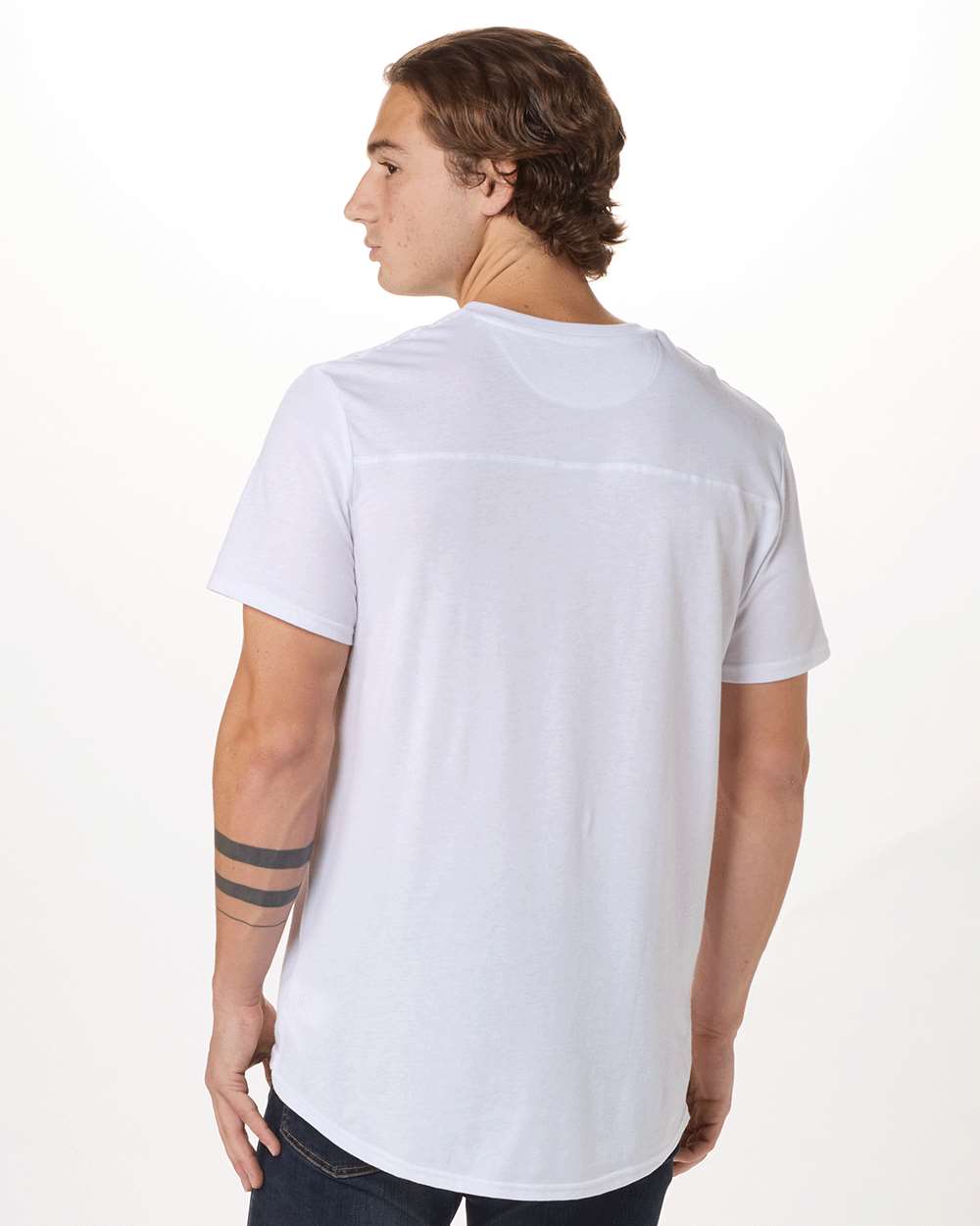 4.28 oz./yd_, 50/50 cotton/polyester Regular fit Double brushed jersey Rounded bottom drop tail Folded neck band Contrast self back neck tape Turn...