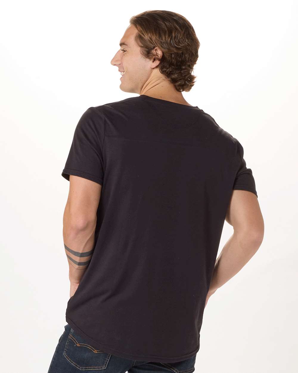 4.28 oz./yd_, 50/50 cotton/polyester Regular fit Double brushed jersey Rounded bottom drop tail Folded neck band Contrast self back neck tape Turn...