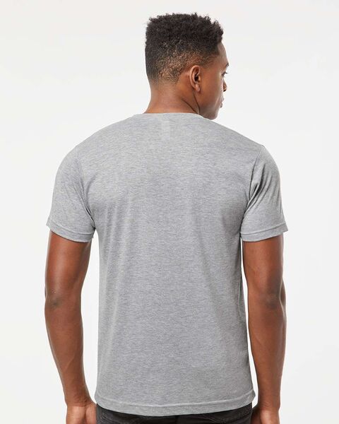 3.6 oz./yd_, 65/35 polyester/combed ring-spun USA premium cotton, 30 singles Heat-set to minimize shrinkage Ribbed v-neck collar Back neck tape...