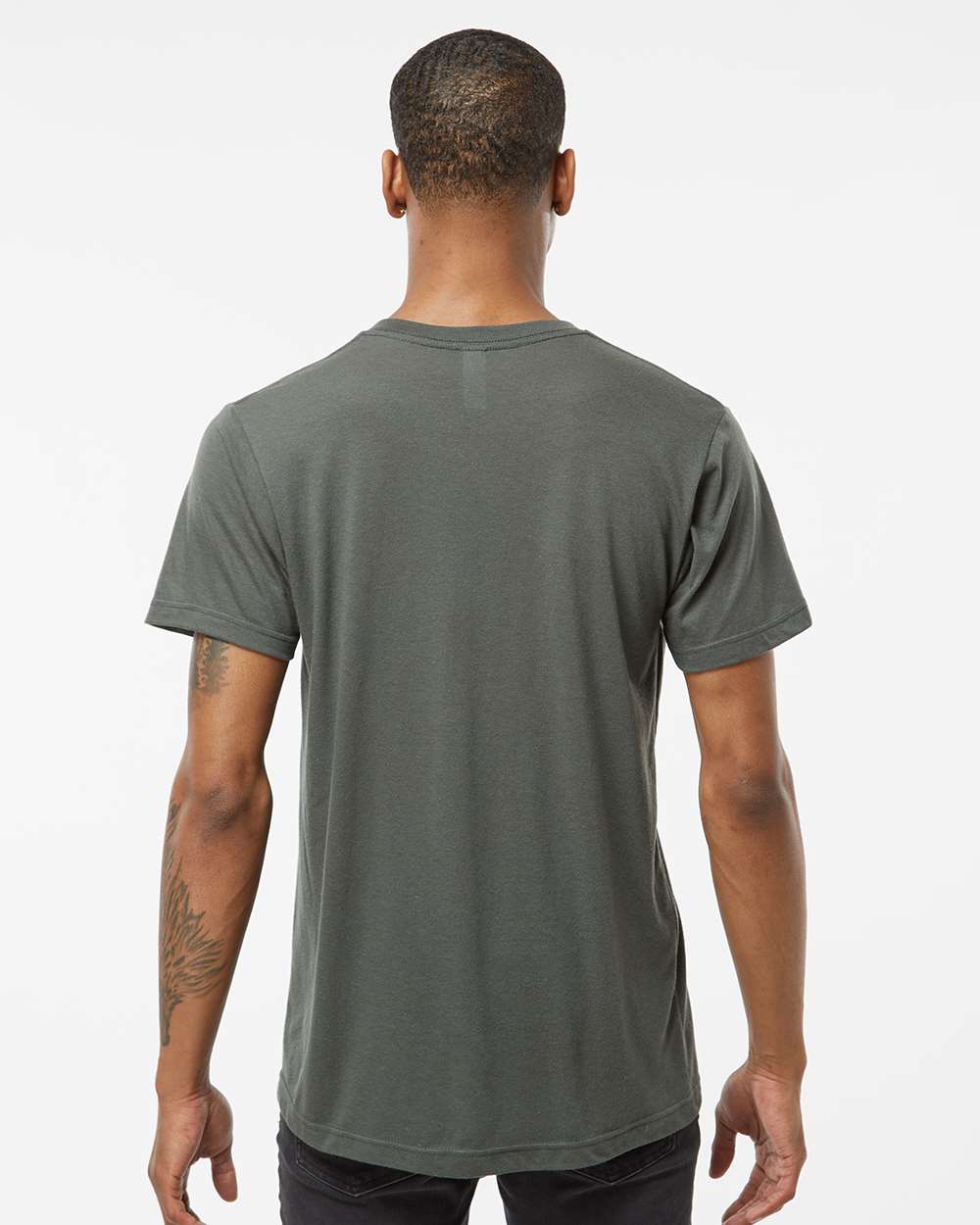 3.6 oz./yd_, 65/35 polyester/combed ring-spun USA premium cotton, 30 singles Heat-set to minimize shrinkage Ribbed v-neck collar Back neck tape...
