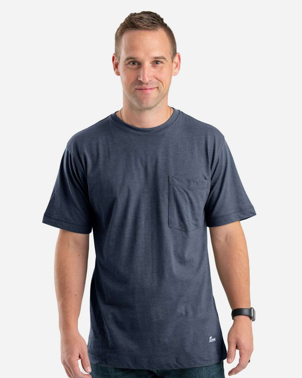 4.2 oz., 60/40 cotton/polyester jersey Moisture wicking Performance fit Stain release Taped neck seam for comfort Chest pocket Tagless label