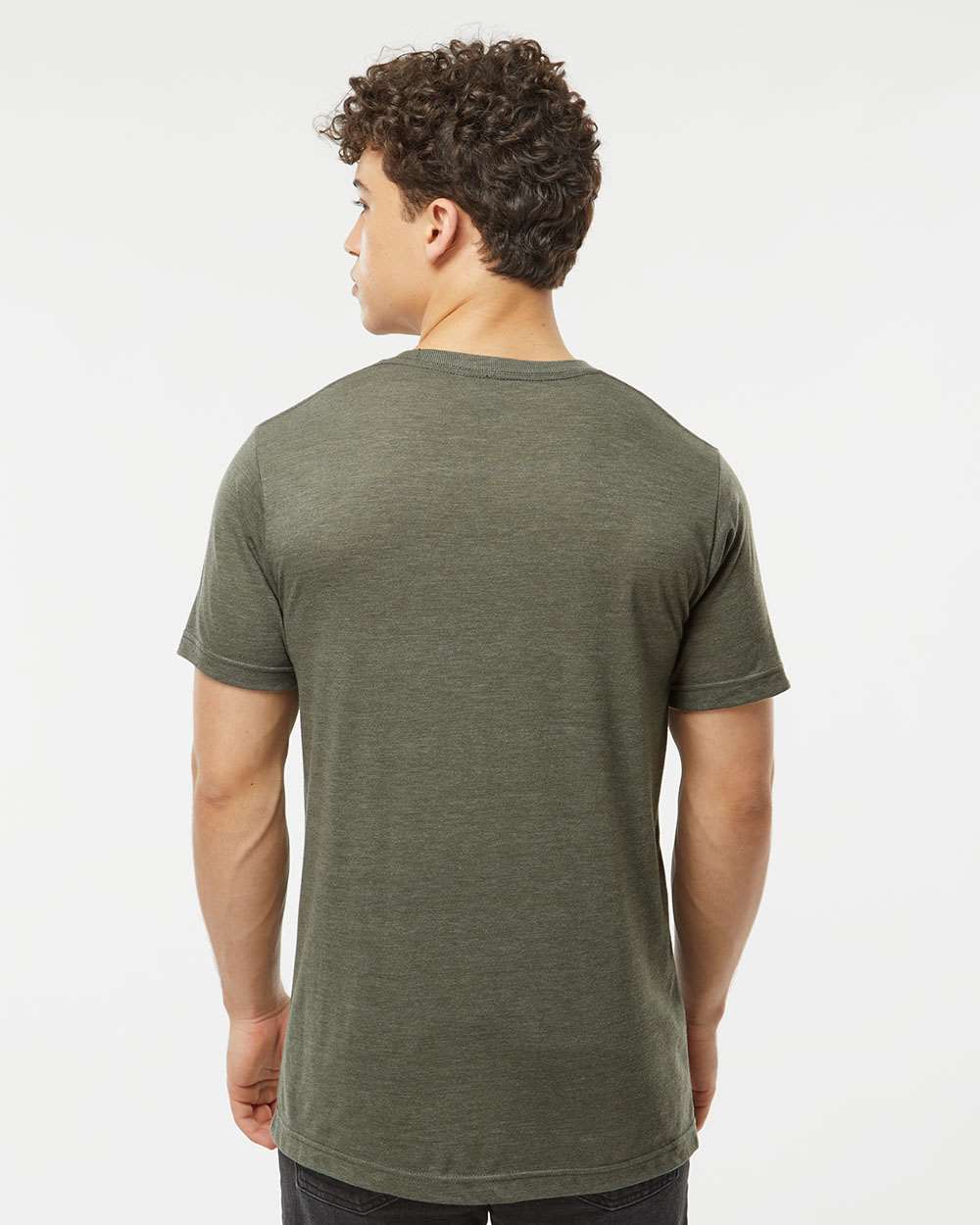 3.7 oz./yd_, 50/25/25 polyester/ring-spun USA premium cotton/rayon, 30 singles Ribbed crewneck collar Taped neck and shoulders Side seams Double-needle...