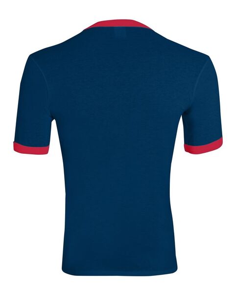 4.8 oz./yd_, 50/50 cotton/polyester jersey knit Double-needle stitched hemmed bottom Contrast color collar and cuffs Set in sleeves Satin label