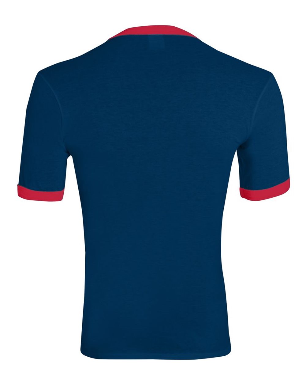 4.8 oz./yd_, 50/50 cotton/polyester jersey knit Double-needle stitched hemmed bottom Contrast color collar and cuffs Set in sleeves Satin label