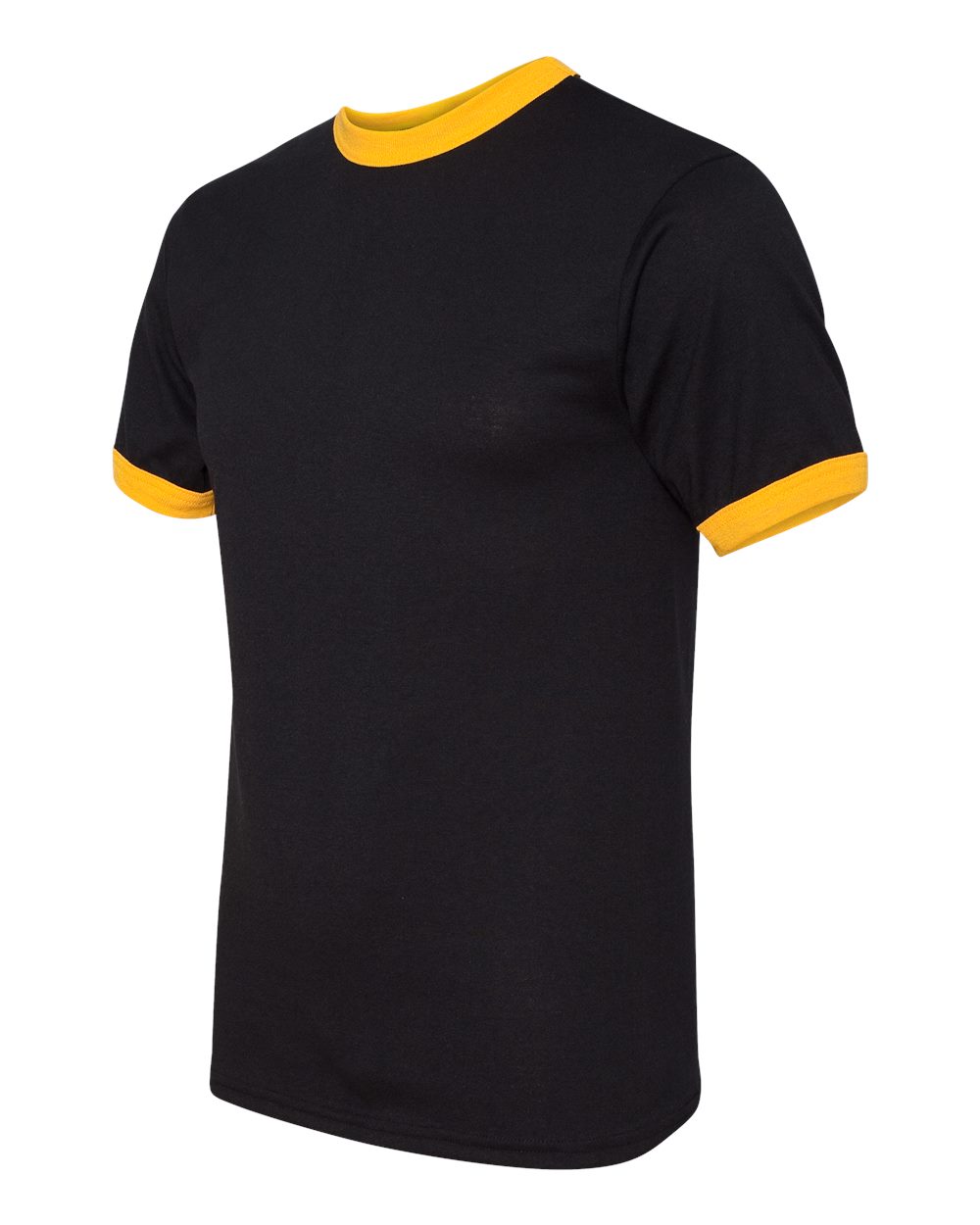4.8 oz./yd_, 50/50 cotton/polyester jersey knit Double-needle stitched hemmed bottom Contrast color collar and cuffs Set in sleeves Satin label