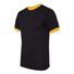 4.8 oz./yd_, 50/50 cotton/polyester jersey knit Double-needle stitched hemmed bottom Contrast color collar and cuffs Set in sleeves Satin label