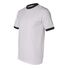 4.8 oz./yd_, 50/50 cotton/polyester jersey knit Double-needle stitched hemmed bottom Contrast color collar and cuffs Set in sleeves Satin label