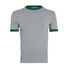 4.8 oz./yd_, 50/50 cotton/polyester jersey knit Double-needle stitched hemmed bottom Contrast color collar and cuffs Set in sleeves Satin label