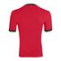 4.8 oz./yd_, 50/50 cotton/polyester jersey knit Double-needle stitched hemmed bottom Contrast color collar and cuffs Set in sleeves Satin label