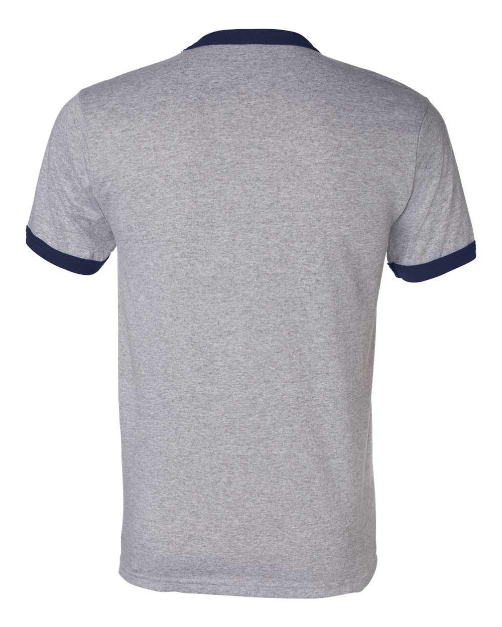 4.8 oz./yd_, 50/50 cotton/polyester jersey knit Double-needle stitched hemmed bottom Contrast color collar and cuffs Set in sleeves Satin label
