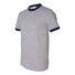 4.8 oz./yd_, 50/50 cotton/polyester jersey knit Double-needle stitched hemmed bottom Contrast color collar and cuffs Set in sleeves Satin label