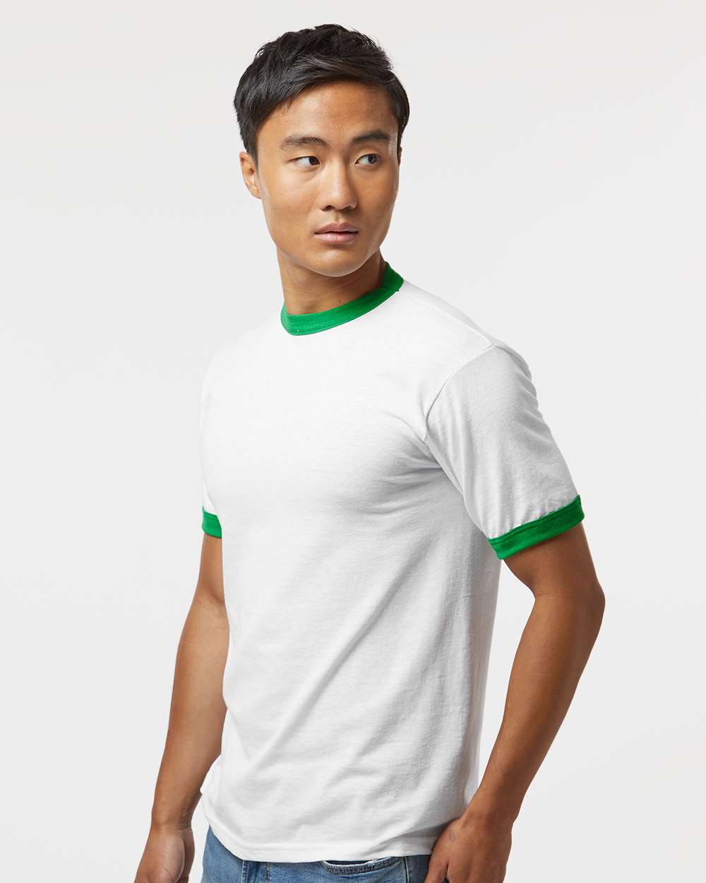 4.8 oz./yd_, 50/50 cotton/polyester jersey knit Double-needle stitched hemmed bottom Contrast color collar and cuffs Set in sleeves Satin label