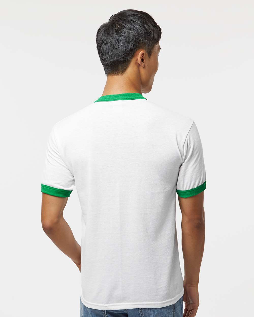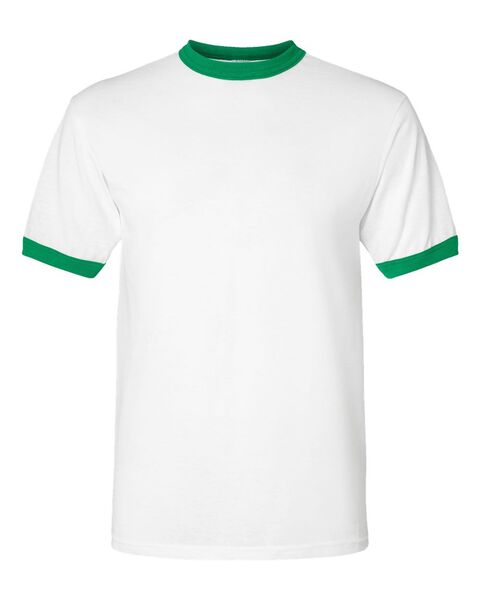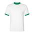 4.8 oz./yd_, 50/50 cotton/polyester jersey knit Double-needle stitched hemmed bottom Contrast color collar and cuffs Set in sleeves Satin label