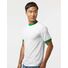 4.8 oz./yd_, 50/50 cotton/polyester jersey knit Double-needle stitched hemmed bottom Contrast color collar and cuffs Set in sleeves Satin label