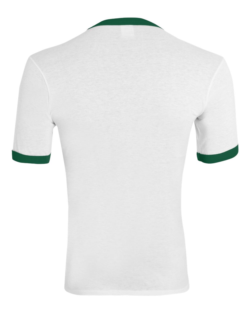 4.8 oz./yd_, 50/50 cotton/polyester jersey knit Double-needle stitched hemmed bottom Contrast color collar and cuffs Set in sleeves Satin label