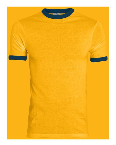 4.8 oz./yd_, 50/50 cotton/polyester jersey knit Double-needle stitched hemmed bottom Contrast color collar and cuffs Set in sleeves Satin label
