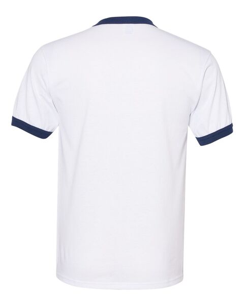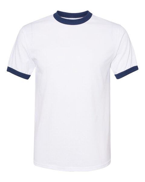4.8 oz./yd_, 50/50 cotton/polyester jersey knit Double-needle stitched hemmed bottom Contrast color collar and cuffs Set in sleeves Satin label