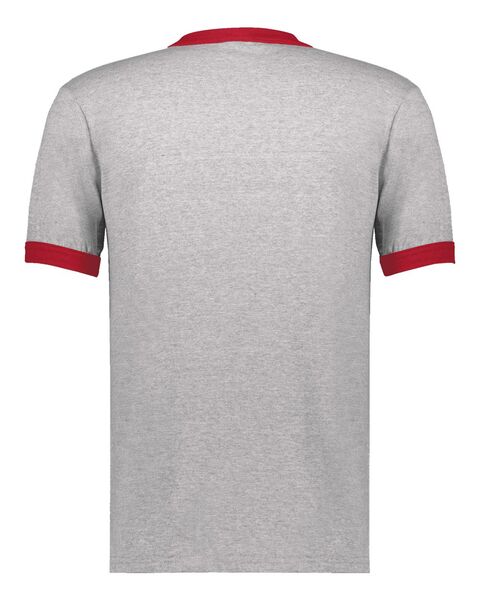 4.8 oz./yd_, 50/50 cotton/polyester jersey knit Double-needle stitched hemmed bottom Contrast color collar and cuffs Set in sleeves Satin label