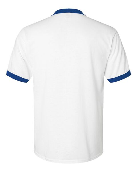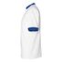 4.8 oz./yd_, 50/50 cotton/polyester jersey knit Double-needle stitched hemmed bottom Contrast color collar and cuffs Set in sleeves Satin label