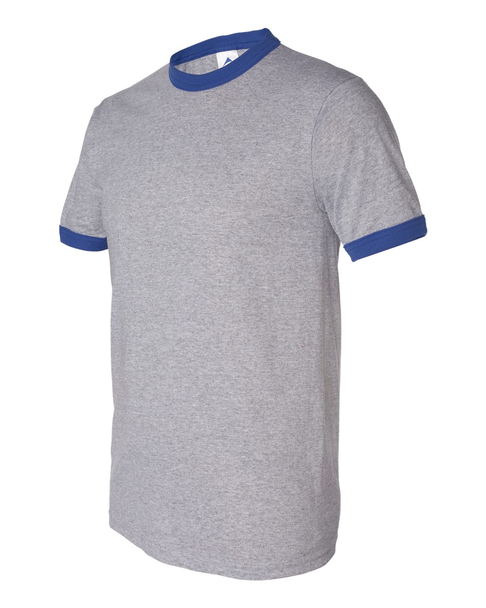 4.8 oz./yd_, 50/50 cotton/polyester jersey knit Double-needle stitched hemmed bottom Contrast color collar and cuffs Set in sleeves Satin label