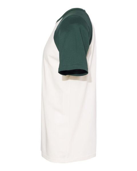 4.3 oz./yd_, 100% combed ringspun cotton, 32 singles Heather Grey is 90/10 cotton/poyester Fabric laundered Contrast raglan sleeves and bound neck...
