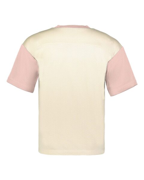 6 oz./yd_, two layers of 100% polyester sport mesh Oversized, boxy fit Self-collar Set-in sleeves Hanger loop label