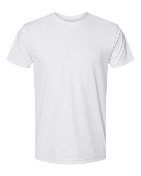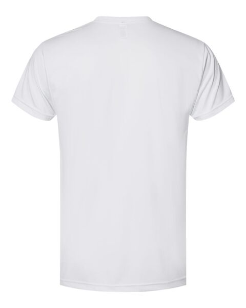 4.5 oz./yd_, 100% polyester Shoulder-to-shoulder taping Double-needle stitched sleeves and bottom hem Tear away label