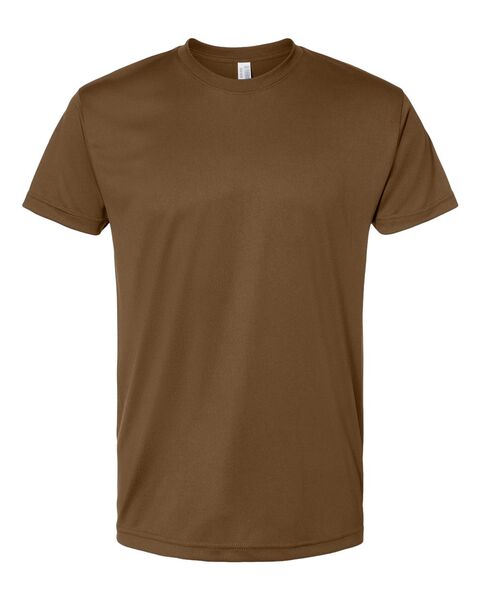 4.5 oz./yd_, 100% polyester Shoulder-to-shoulder taping Double-needle stitched sleeves and bottom hem Tear away label