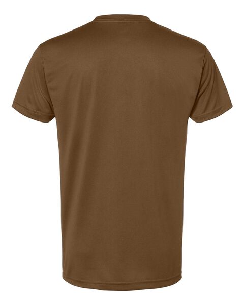 4.5 oz./yd_, 100% polyester Shoulder-to-shoulder taping Double-needle stitched sleeves and bottom hem Tear away label