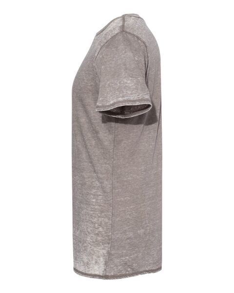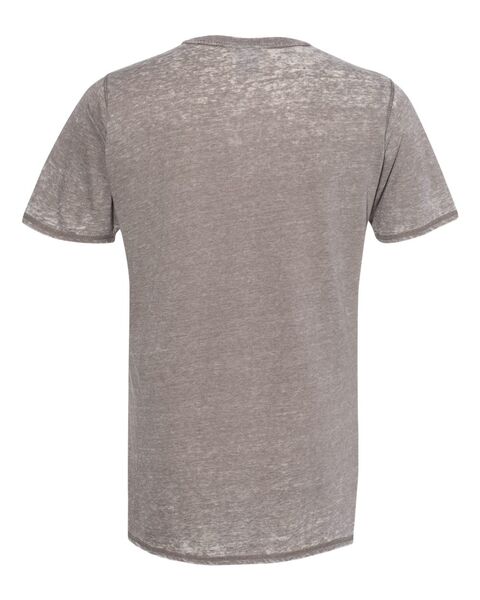4 oz./yd_, 50/50 cotton/polyester burnout jersey Acid-washed with silicone finish Self-fabric collar Flatlock-stitched throughout Tear away label