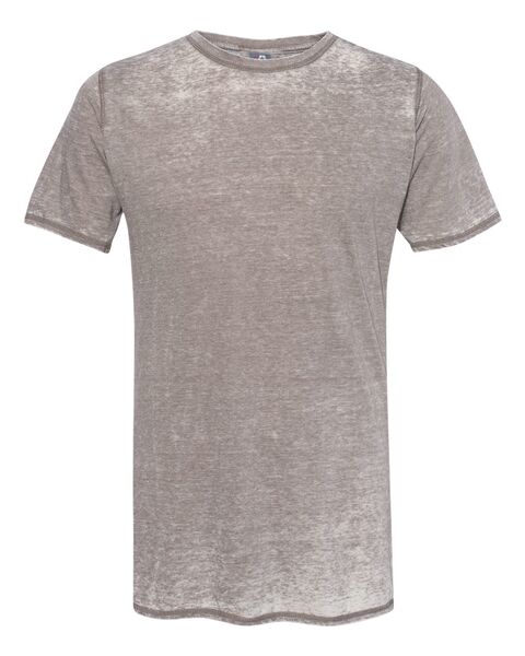 4 oz./yd_, 50/50 cotton/polyester burnout jersey Acid-washed with silicone finish Self-fabric collar Flatlock-stitched throughout Tear away label