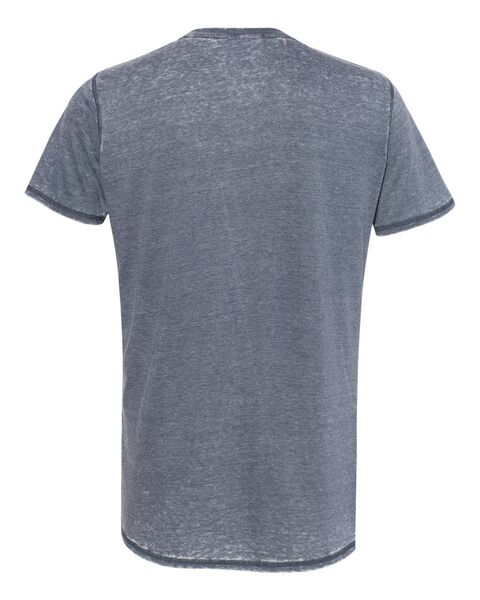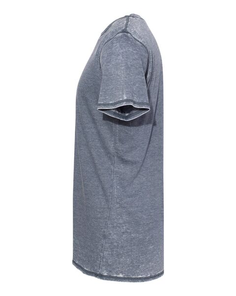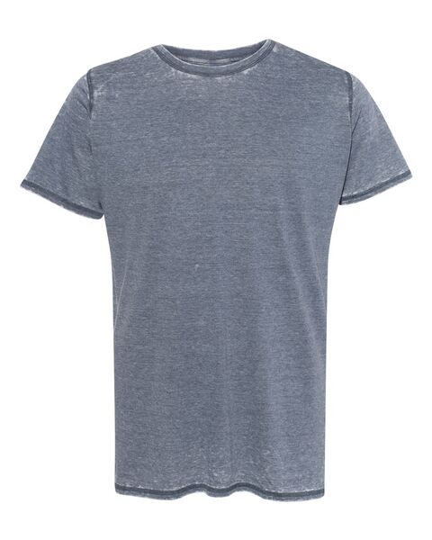 4 oz./yd_, 50/50 cotton/polyester burnout jersey Acid-washed with silicone finish Self-fabric collar Flatlock-stitched throughout Tear away label