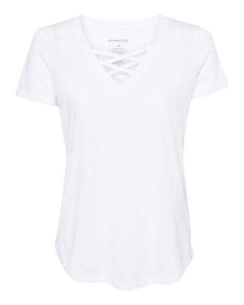 4.3 oz./yd_, 80/20 polyester/cotton sueded jersey Contoured waistline for a feminine fit Mitered V-neck Crisscross front neckline detail Double-needle...