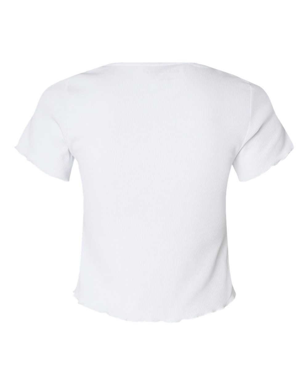 5.9 oz./yd_, 96/4 cotton/spandex, rib knit Slim rib fit Length falls at top of waistband Square neck shaping  Lettuce edge sleeve and bottom...