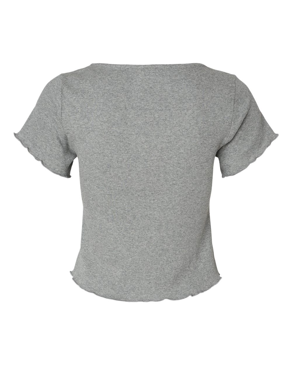 5.9 oz./yd_, 96/4 cotton/spandex, rib knit Slim rib fit Length falls at top of waistband Square neck shaping  Lettuce edge sleeve and bottom...