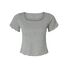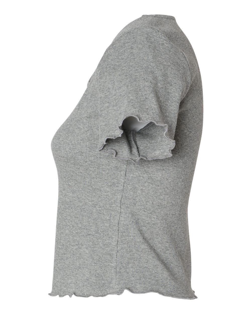 5.9 oz./yd_, 96/4 cotton/spandex, rib knit Slim rib fit Length falls at top of waistband Square neck shaping  Lettuce edge sleeve and bottom...