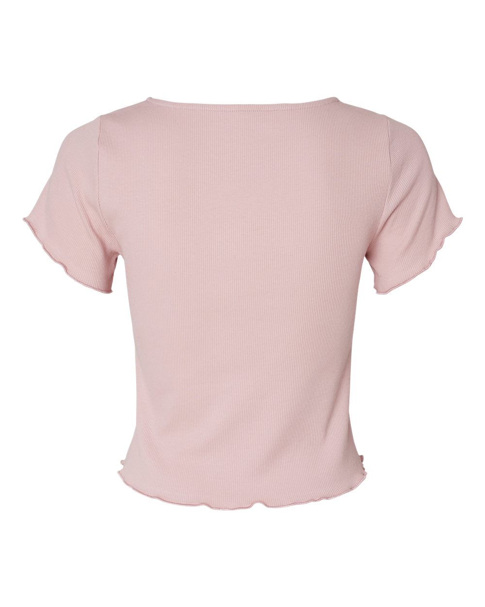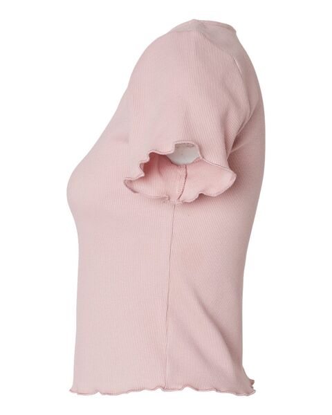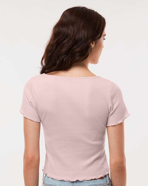 5.9 oz./yd_, 96/4 cotton/spandex, rib knit Slim rib fit Length falls at top of waistband Square neck shaping  Lettuce edge sleeve and bottom...