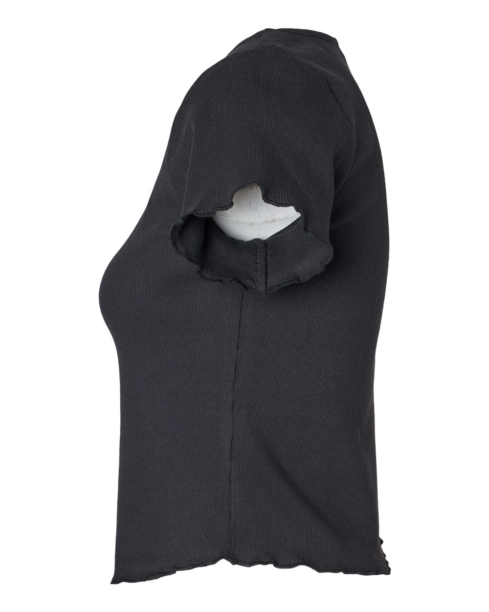 5.9 oz./yd_, 96/4 cotton/spandex, rib knit Slim rib fit Length falls at top of waistband Square neck shaping  Lettuce edge sleeve and bottom...
