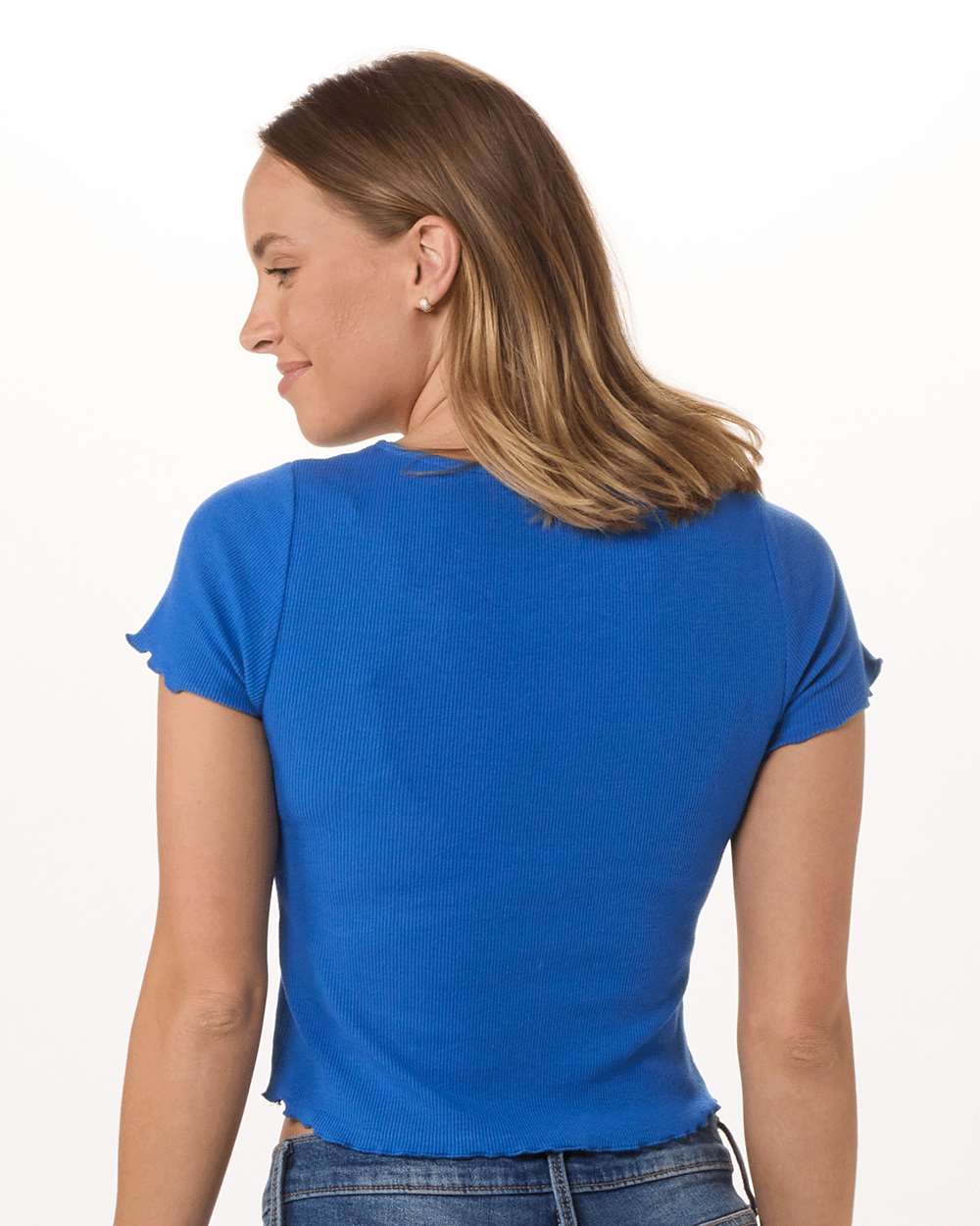 5.9 oz./yd_, 96/4 cotton/spandex, rib knit Slim rib fit Length falls at top of waistband Square neck shaping  Lettuce edge sleeve and bottom...