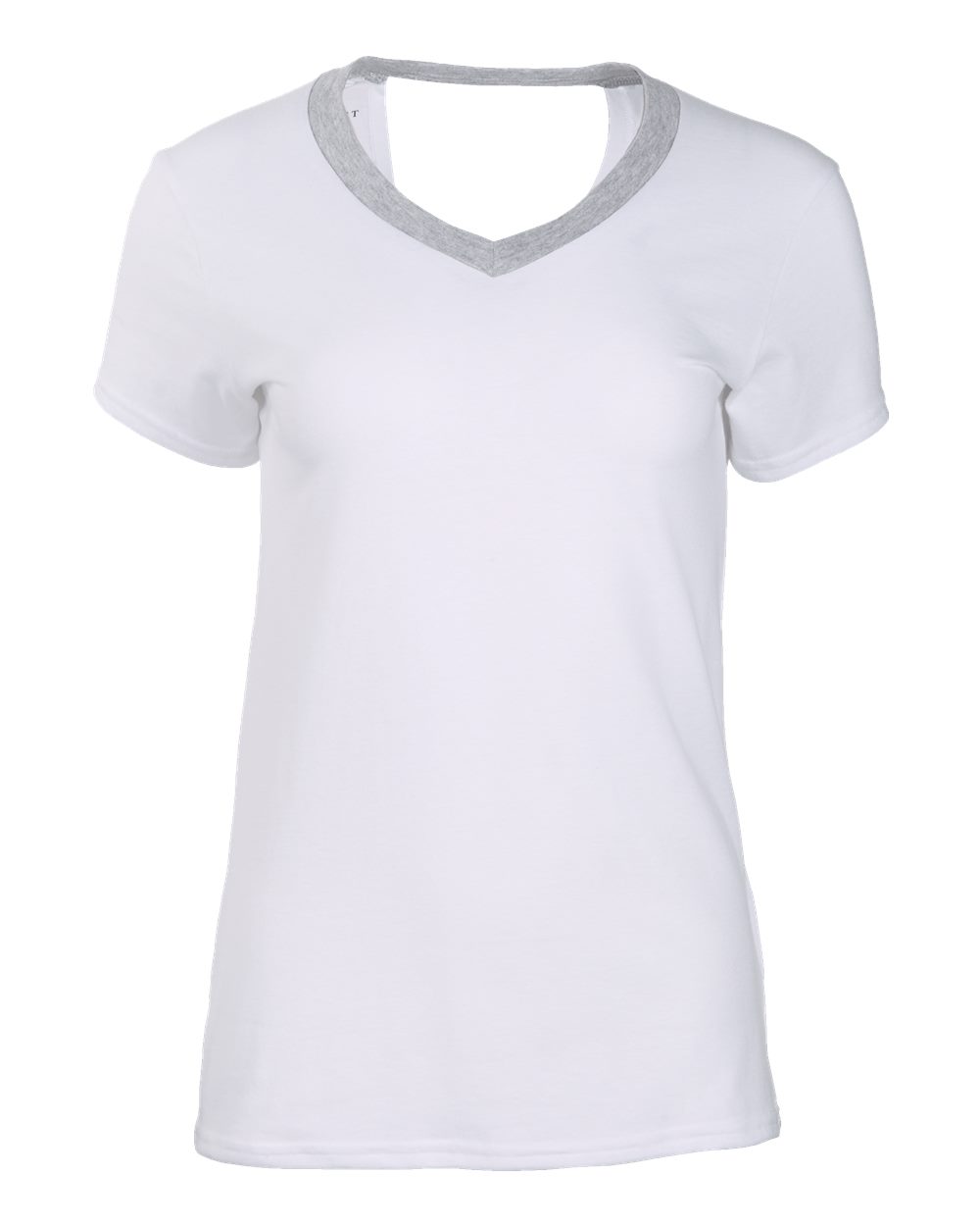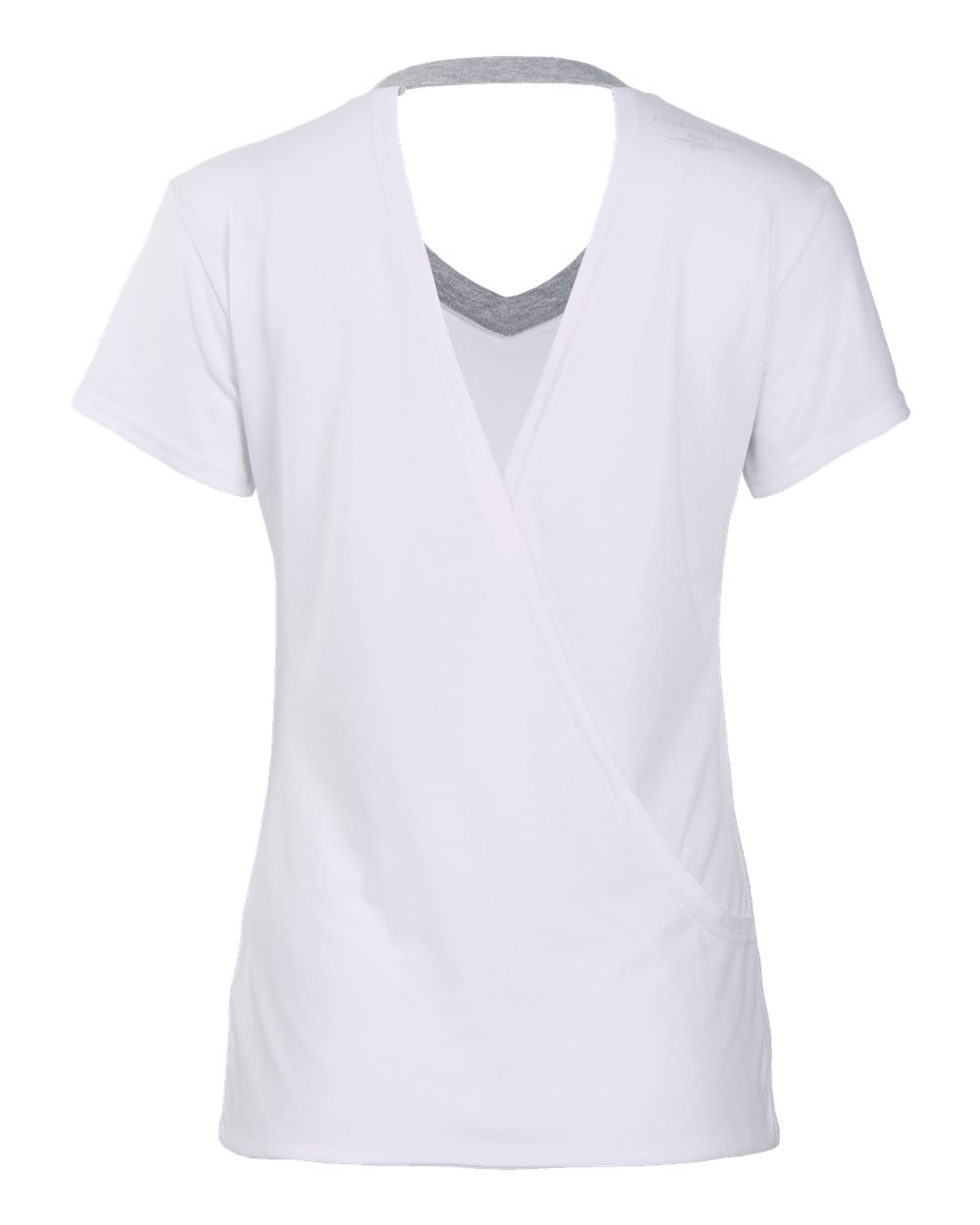 4.28 oz./yd_, 50/50 polyester/cotton, double brushed jersey Regular fit Crossover back detailing Ribbed neckline Turn back at bottom and sleeve...